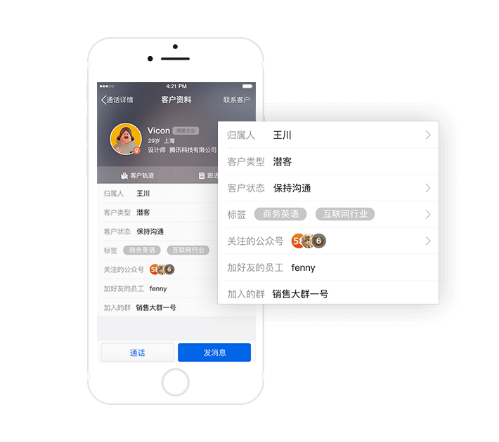 在腾讯企点的客户库中自动/人工备案客户的来源、归属人、身份信息、联系方式等详细信息,为后续的销售跟进提供丰富的数据支持
